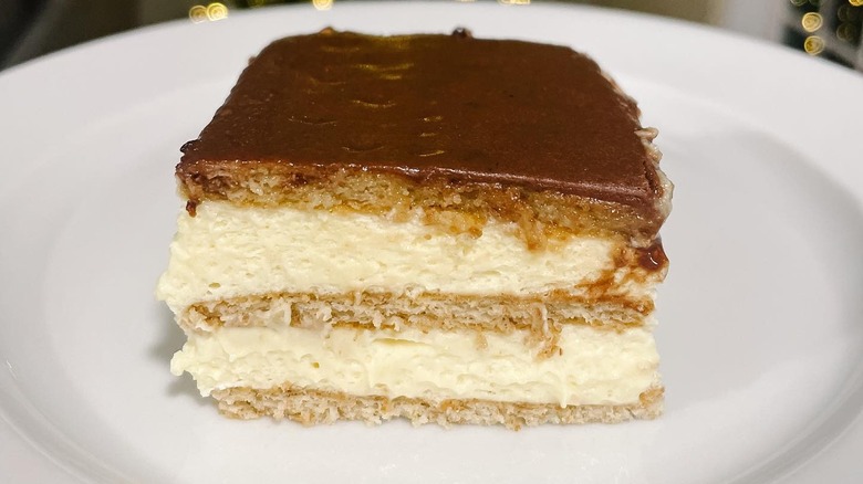 The chocolate éclair cake is a style of icebox cake that was majorly trending in the 1980s. To make it, start by whipping up some instant vanilla pudding mix with milk, then fold whipped cream into it. Layer some graham crackers in a pan or baking dish, then top them with the pudding mix, and repeat the layers until the pan is almost full. The final layer is chocolate frosting. After a few hours in the fridge, the graham crackers will soften and all the flavors will meld together to create a lighter, cooler, and creamier version of an éclair.