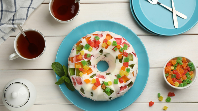The recipe for crown jewel cake first appeared on Jell-O packages in the 1950s and it called for cherry, orange, and lime Jell-O. Of course, you can choose any flavors you like. The Jell-O is cooled until set, then cut into cubes. The main part of the cake is traditionally made with lemon Jell-O, sugar, and pineapple juice that's mixed together, chilled to thicken it a bit, then mixed with whipped cream. The final step is pouring the base and the Jell-O cubes into a cake pan lined with graham cracker crust, and chilling the cake. As an added touch, you can serve it with whipped cream on top.