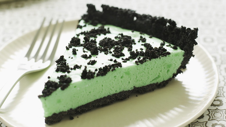 Cool, creamy, and minty, grasshopper pie is the perfect refreshing treat on a hot day. It gets its somewhat odd name from the grasshopper cocktail, a sweet concoction that consists of crème de menthe, crème de cacao, and cream. Those are the main flavors of the pie, along with melted marshmallows and an Oreo cookie crust. It's often served with crumbled cookies, chocolate powder, or chocolate shavings on top and sometimes a dollop of whipped cream.