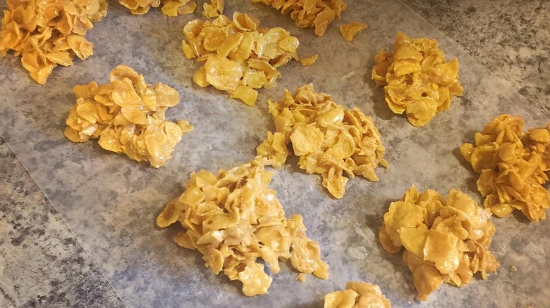 With just a few ingredients and no oven time, peanut butter cornflake cookies are one of those low-effort, high-reward desserts. All you need to make them is sugar, corn syrup, peanut butter, and cornflake cereal. First, simmer the sugar with the corn syrup until the sugar is dissolved, then mix in the peanut butter. Stir in the cornflakes until they're thoroughly coated, then drop spoonfuls of the mixture onto a tray and you're done. Once they've cooled, you have a tasty sweet treat that's crunchy, chewy, and nutty.