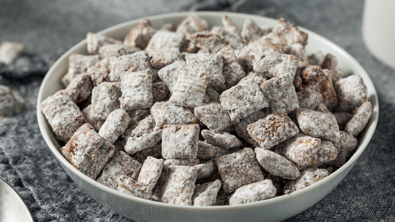 Unless you're from the Midwest, you could be forgiven for thinking that puppy chow is something you'd feed to a furry friend. However, this sweet, salty, and crispy snack is very much beloved by humans of all ages. It also goes by the names Muddy Buddies and reindeer chow but the recipe is basically the same. Chex cereal gets tossed in a mixture of melted butter, semi-sweet chocolate, and peanut butter. When it's thoroughly coated, the sweet Chex mix is tossed in powdered sugar.