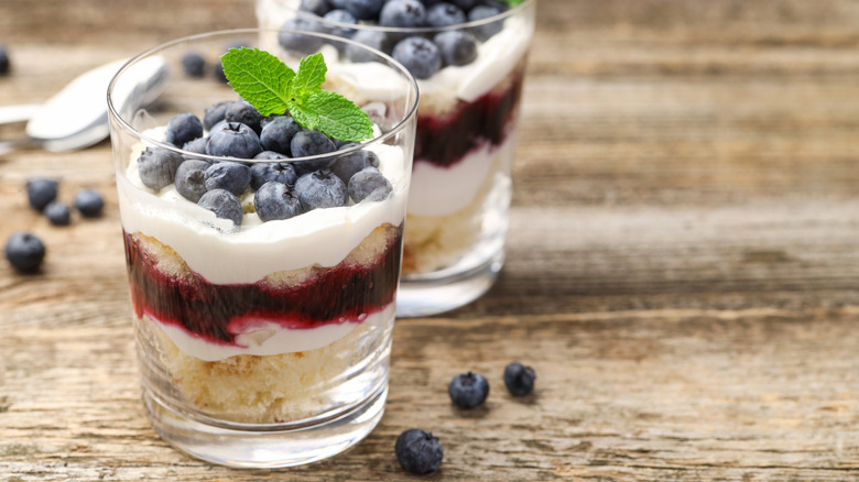 One of the key characteristics of a trifle is that it's served in a glass vessel so that you can see all the colorful layers. You can go simple with layers of graham crackers or sponge cake, whipped cream, and fresh berries. Then again, if you want to make something a bit more decadent, you can use rich custard or pudding and add baked goods like brownies or cookies. The sky's the limit when it comes to the ingredients. However, savory elements are probably best left out — just ask anyone who's seen that episode of "Friends" where Rachel mistakenly added ground beef to her Thanksgiving trifle.