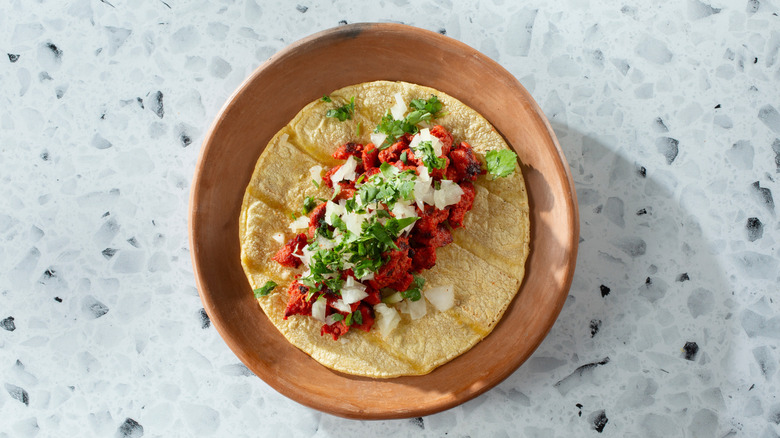 Of Mexico's many meat styles, few are more recognizable than al pastor. Vibrantly orange-colored pork, rotating on a spit, and traditionally served with pineapple — that's certainly a combination of factors that catch the eye. The dish melds several influences, with the shawarma-like assembly owing to Lebanese immigrants to Mexico. And indeed, the large rotating skewer is a central component. After all, food prepared al pastor means "shepard's style," in reference to the preparation of livestock with the technique.