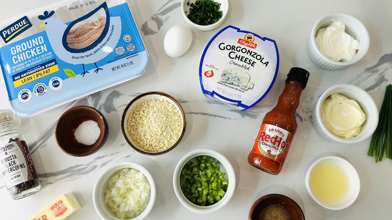 Gather the ingredients for Buffalo chicken and Gorgonzola meatballs