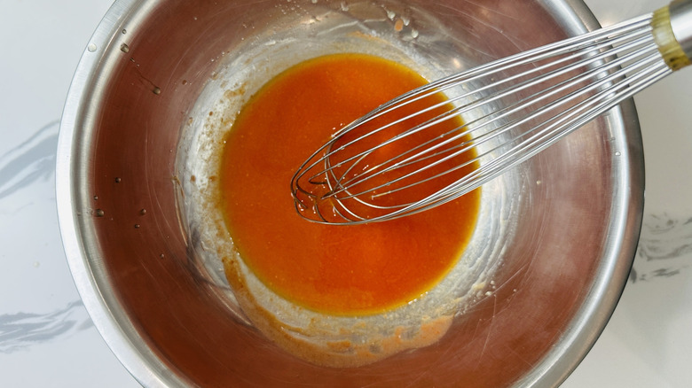 - In a large bowl, combine the melted butter, hot sauce, and brown sugar.