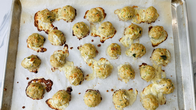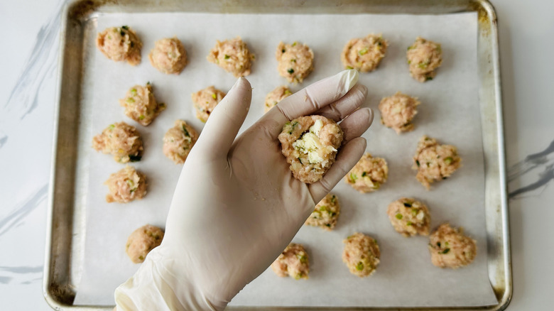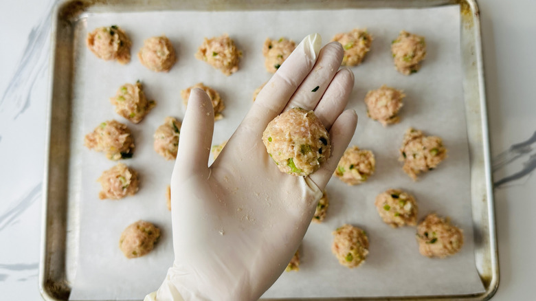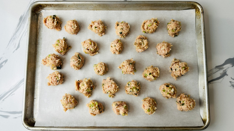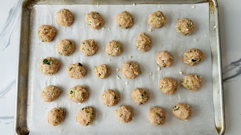 - Use a tablespoon-sized scoop to portion meatballs onto the prepared baking sheet.