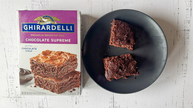 Ghirardelli knows how to do chocolate. It ranked high on our list of the best popular chocolate bars, but I can't say that its brownies had the same luck. I'm not convinced that these brownies are actually brownies — I think along the way there was a box of cake mix that got mislabeled. They're soft and plush in a way that a good chocolate cake can be, but they lack the chewiness and depth of flavor of a proper brownie mix. The crackle is almost nonexistent.