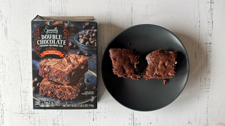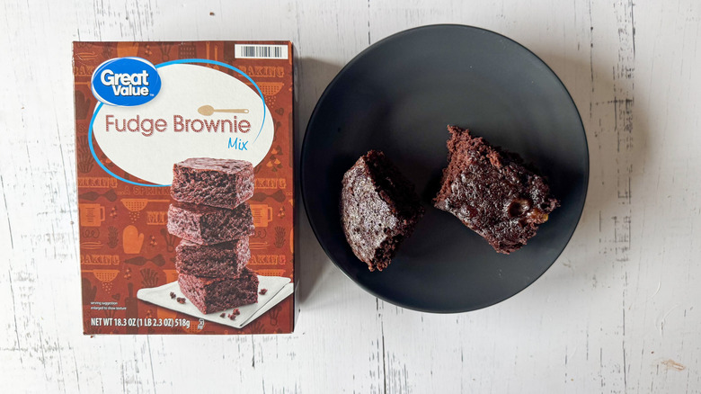 The flavor of these brownies is average — it's not particularly chocolatey, but it's not gritty and cheap-tasting either. They would probably be better served with a scoop of ice cream to make them more exciting, or studded with candy add-ins.