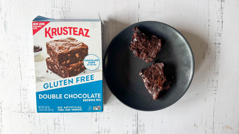 Krusteaz was one of two gluten-free brownie mixes that I tried for this ranking. The brand is well-known for its pancake mixes, but also carries a vast selection of gluten-free products. At first glance, you might think that this is a really good brownie. It has a better sheen than some of the higher-ranked brands on this list, and it's delectably thin. However, looks can be deceiving, as I've found out all too well with this brownie mix.