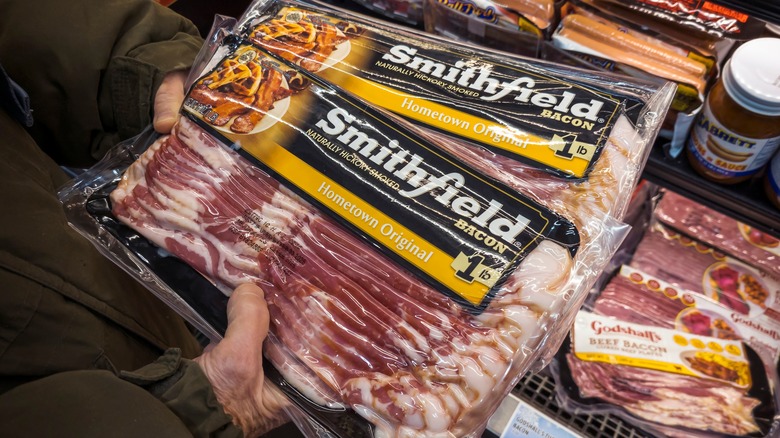 Where there's ham, there's a way. Or so the saying (probably) goes. At Smithfield, pork is king with products ranging from bacon — there is a best way to cook bacon, by the way — hot dogs, ham, and breakfast sausage. And truth be told, the brand has always been like this. It was founded in 1936 under what would become the Smithfield Packing Company name by a father and son duo, both named Joseph W. Luter, in the namesake town of Smithfield, Virginia. Over time, the pork brand expanded with acquisitions and today, Smithfield is a sub-brand of the larger Smithfield Foods.