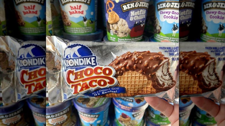 This ice cream "sandwich" of sorts was made with a waffle cone taco shell, vanilla ice cream interspersed with decadent chocolate fudge, and topped with a hard chocolate and peanut shell. It was truly unlike any other ice cream novelty that came before it. Sadly, Good Humor-Breyers axed the Choco Taco in 2022 — much to the dismay of its beloved fans. While Salt & Straw, in a partnership with Taco Bell, announced it was developing its own version of the novelty — and several folks have put out copycat recipes over the years — there has been no official announcement of when (or if) this beloved novelty might return.