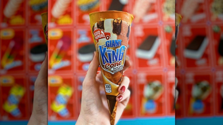 The Chocolate & Vanilla Giant King Cone was made for people who liked to make a statement. It resembles the Drumstick in some ways, but instead of featuring a cap of chocolate on the top, it comes with stripes of chocolate and crumbled peanuts.
