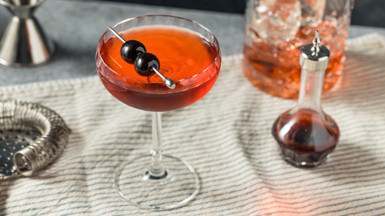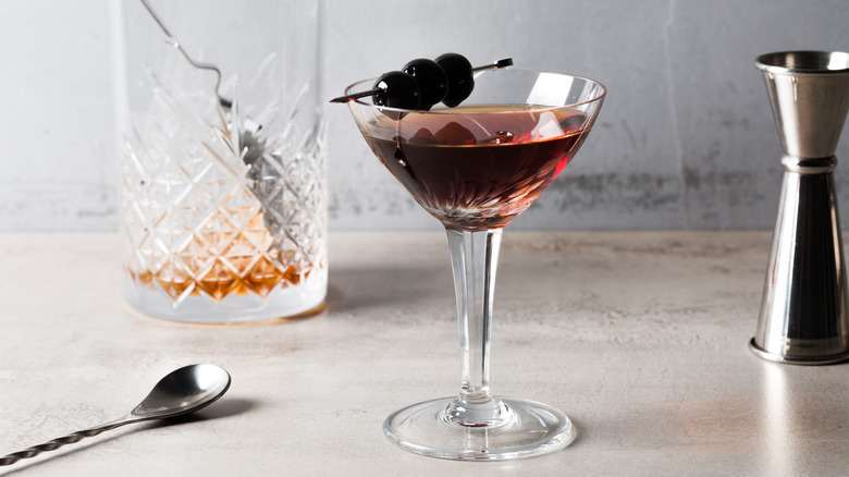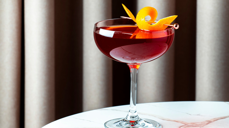 A classic Manhattan has a simple 2:1:2 ratio for its specs, and Lisa Considine teaches us a quick lesson for committing those numbers to memory. She explains, "The easiest way to remember the recipe for a classic Manhattan is the NYC area code which is 212: 2 ounces of bourbon, 1 ounce of sweet vermouth, 2 dashes of bitters." The bitters in the traditional iteration of a Manhattan are usually aromatic bitters like Angostura, another cocktail ingredient that deserves a spot in your kitchen pantry or bar cart. For a unique update, though, Considine replaces the aromatic bitters with chocolate bitters to create a new imbibing experience based on the classic build.