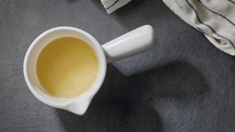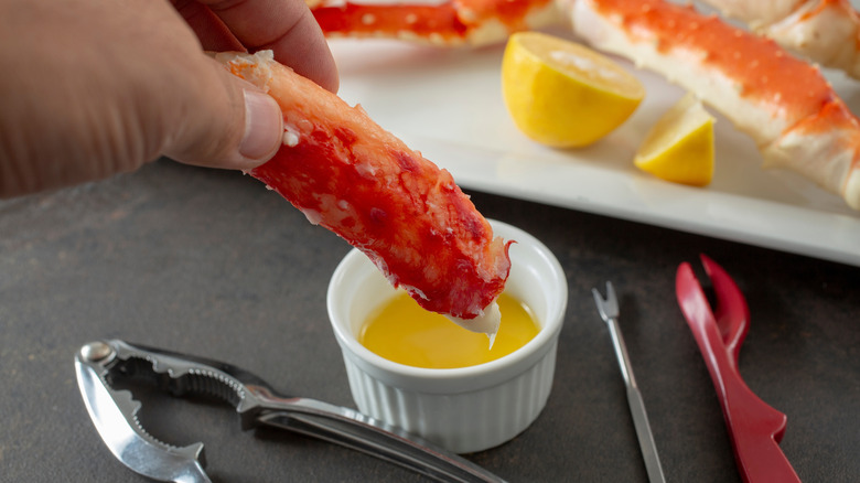 Clarified butter, on the other hand, requires a little more work. It's made by heating the butter until it foams on the top and the milk solids settle on the bottom. The butter foam is then skimmed off and can be saved for other uses, while the milk solids are strained out. The remaining butter can then be used for dipping your crab legs into. Clarified butter has a more pronounced intensity than regular butter and delivers a cleaner mouthfeel than regular melted butter, making it the optimal choice for dipping your crab meat. Both preparations yield a delectable, classic bite that will make the flavors of your crab pop.