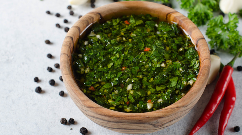 Another benefit of chimichurri is that it lacks the same relentless heat as some of the other sauces on this list, meaning you won't have to worry about having your palate overwhelmed by spice. If you prefer an even less spicy sauce, you can opt for a milder pepper, like a jalapeño, or just use less chile in your chimichurri recipe. Serve it with hot crab legs — either baked or grilled.