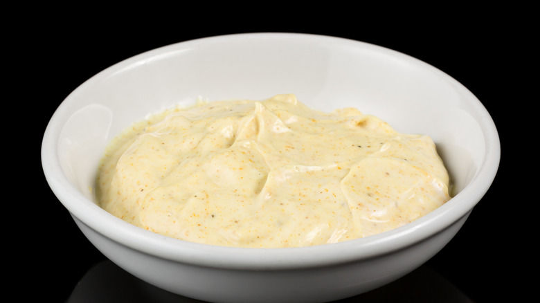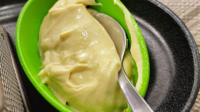 On its own, mayo is creamy, rich, and quite heavy. This makes it an excellent match for wasabi, as it can temper its bite. If you're whipping up this simple dipping sauce at home, try adding in some extra acid, such as lemon juice or vinegar. You can even add extra sweetness with a splash of mirin, or lighten the mouthfeel by adding a greater ratio of creamy ingredients, like mayo, sour cream, or plain Greek yogurt.