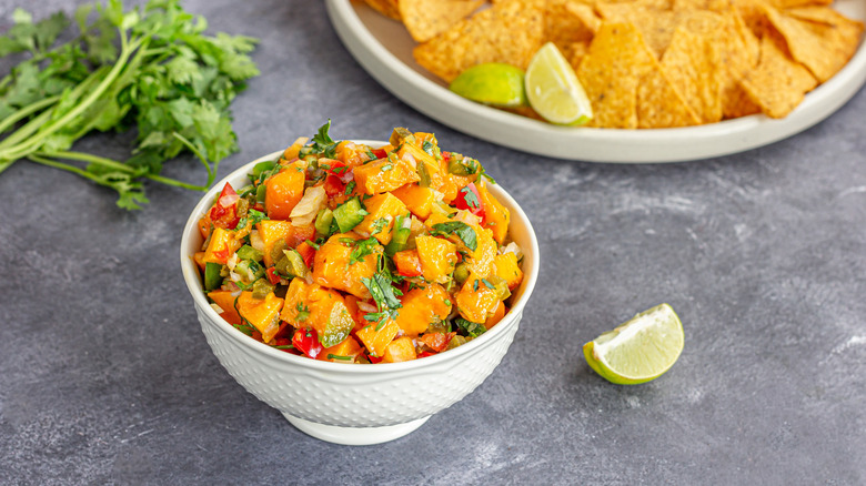 Mango salsa may be more at home with tortilla chips or spooned onto fish tacos, but there's no reason why you can't try it with crab legs, too. Ripe mango is super sweet and flavorful, and it will really draw your taste buds' attention to the meaty, sweet crab. That said, as long as the salsa is properly constructed, its flavor will encompass more than just sweetness. The addition of lemon or lime juice can curb its cloyingness, as can a fistful of jalapeños, cilantro, or chopped chiles.