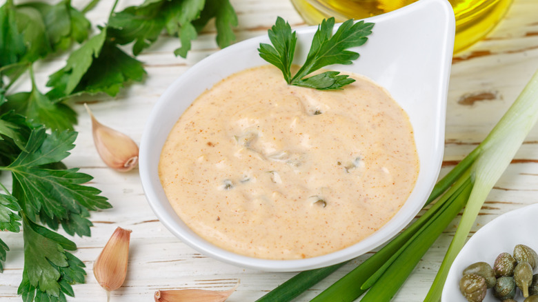If you've traveled to the Big Easy or call it home, you are probably no stranger to remoulade. The flavor-packed sauce has it all going on, from its creamy mayonnaise base to its mustardy pop and salty caper twist. It's a beloved sauce that often accompanies seafood po' boys, fried fish, or seafood dishes as a whole — including crab legs.