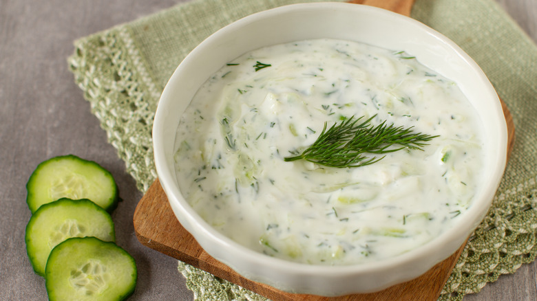 Our next dip takes us across the Mediterranean to Greece — which may not have been a destination you had in mind on our Tour de Crab Legs. But once you try dipping your crab legs in tzatziki, you may never want to go back to boring butter or mayo ever again. This popular Greek dip is made with a Greek yogurt base, olive oil, chopped cucumbers, lemon juice, garlic, and dill. It's creamy and savory yet still lighter than mayonnaise. The addition of dill also helps perk its flavor up and cut through its innate richness.