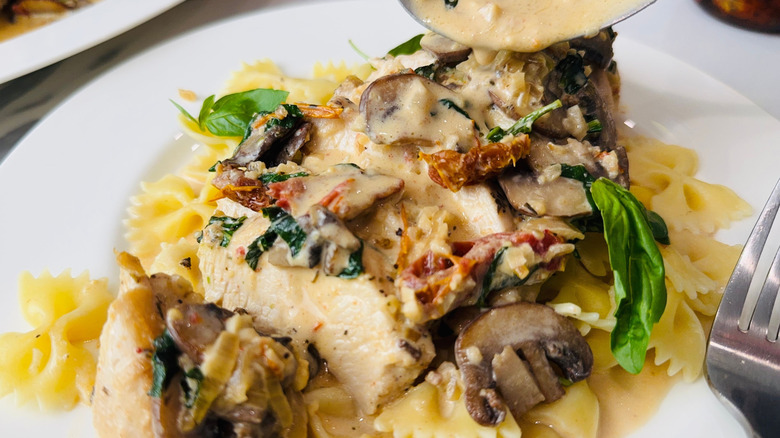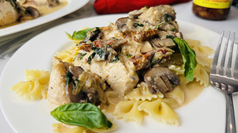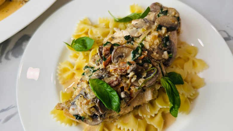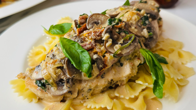 There are many pasta dishes out there with rich, fascinating, and often definitive origin stories, and then there are those like Tuscan chicken. At first glance, the origin of Tuscan chicken seems easy enough — surely it hails from the Tuscany region of Italy, right? Well, as with so many dishes, Tuscan chicken doesn't actually have a clear-cut origin point in Tuscany, though it does reflect a general Tuscan-like approach to cooking. Traditional Tuscan cooking revolves around simplicity, showcasing tried-and-true ingredients (like chicken and mushrooms) in a non-fussy way that ideally will serve a crowd. So, looking at it from that standpoint, it's easy to see why this dish might be called Tuscan chicken.