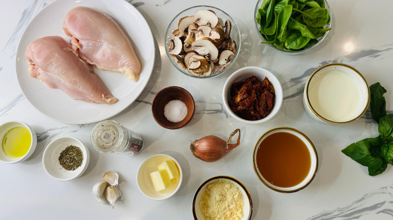 You'll need chicken breasts to kick off this recipe, along with salt, black pepper, and Italian seasoning to season the breasts and olive oil to brown them. To build the creamy sauce, you'll need butter, mushrooms, more salt, a shallot, garlic, optional white wine for deglazing the pan, chicken stock, sundried tomatoes, and heavy cream. For final touches, you'll stir spinach, Parmesan cheese, and fresh basil into the sauce, and when it comes time to serve, you may want extra fresh basil to garnish and cooked pasta to pair with the Tuscan chicken.