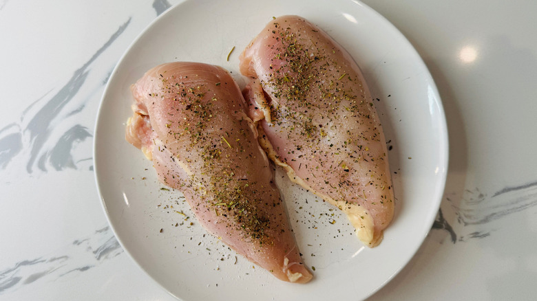 - Season the chicken breasts on both sides with ½ teaspoon salt, Italian seasoning, and ¼ teaspoon pepper.
