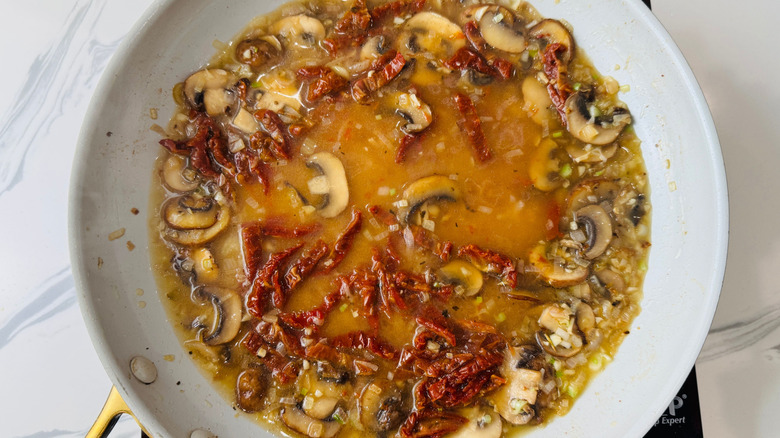 - If using, deglaze the pan with white wine, cooking it down until it's almost completely reduced.