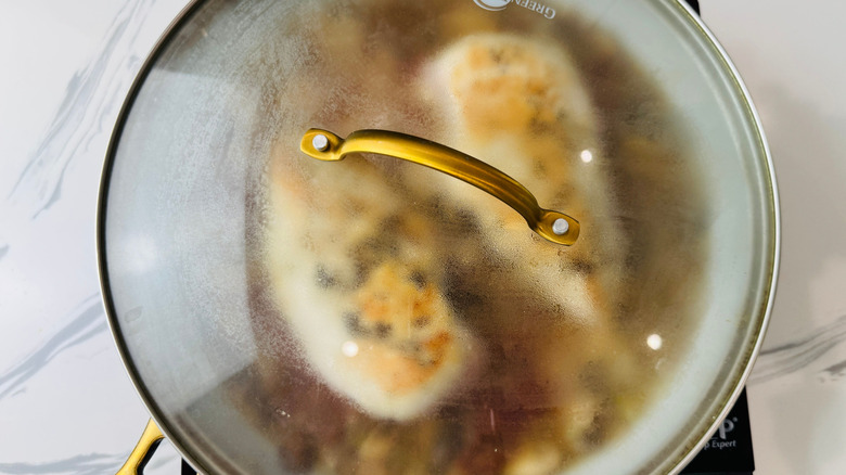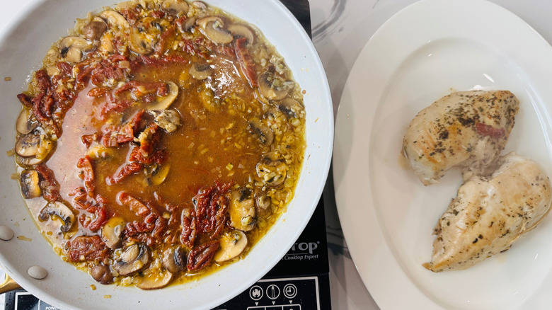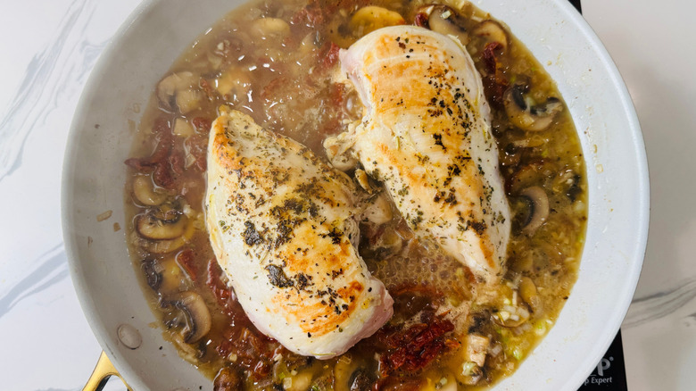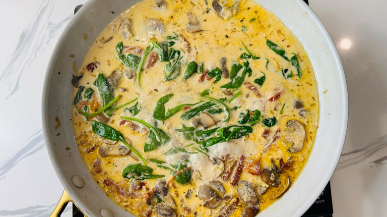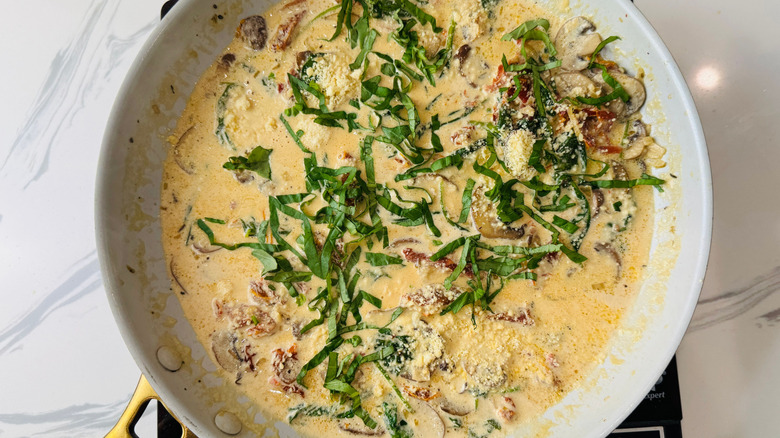 Despite already being such an easy dish to throw together on a weeknight, if you're looking to simplify Tuscan chicken even more to the point of preparing it ahead of time, we have a few tips for you. "If you do want to prep it in advance, consider swapping the chicken breasts for boneless chicken thighs so they won't dry out when reheating the way breasts can (adjusting the cooking time as needed until the internal temperature of the thickest part of the thighs reaches 165 F)," Rosenhouse advises. If you take this route, you can prepare the dish as written almost in its entirety — just stop before adding in the cream and spinach to the sauce. Let everything cool down, then transfer it all into the fridge for up to three days. "Reheat covered on the stovetop, adding a splash of broth if needed to loosen the sauce, until hot throughout," Rosenhouse says, then remove the chicken from the pan, add in the spinach and cream, and finish the recipe as written.