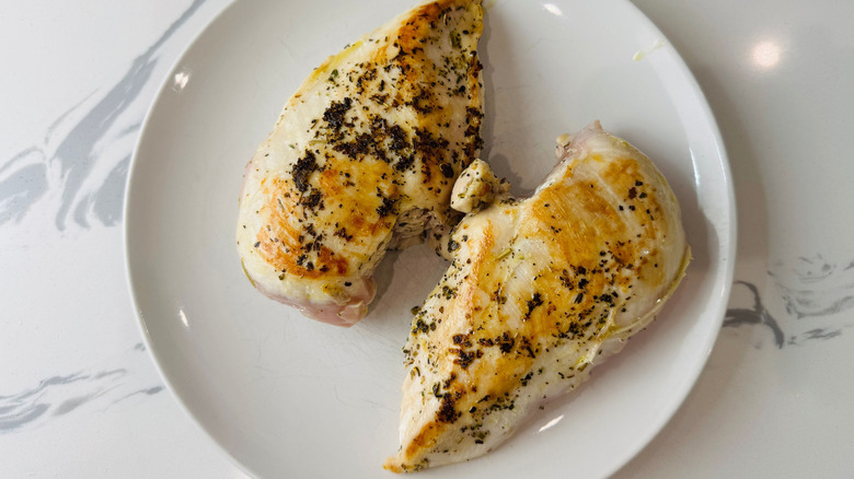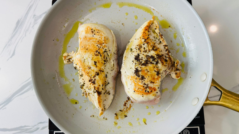 For those who aren't looking to make the dish in advance but want to cut down on that cooking time even more, Rosenhouse recommends splitting the chicken breasts in half to form cutlets. By doing so, the chicken won't need as much time to cook through.