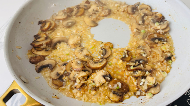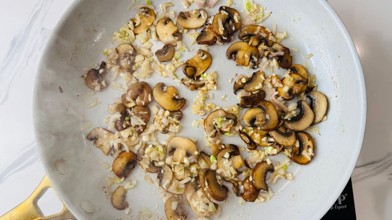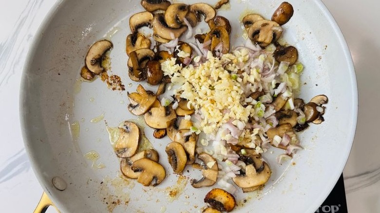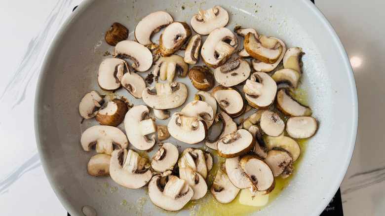 - Add the butter, mushrooms, and ¼ teaspoon salt to the pan.