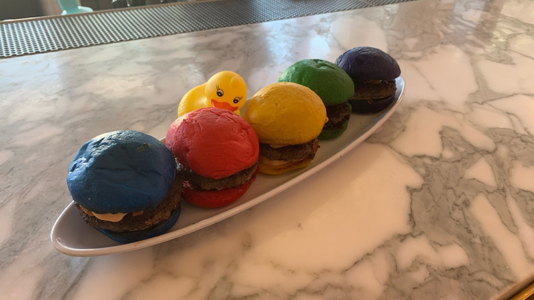National chain Sugar Factory offers a "signature" Rainbow Sliders appetizer that consists of five mini burgers served on colorful buns with American cheese, crispy onions, pickles, and (again) a "signature" Sugar Factory sauce (spoiler- looks and tastes like Thousand Island). All this and a complimentary Sugar Factory Duck! The rainbow buns follow the chain's branding, which frequently features candy-like circles of the same color sequence.
