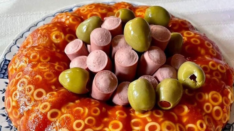 Gelatin — a water-soluble, collagen-derived animal protein that's liquid when hot and solid when chilled — was all the rage back in the '50s, '60s, and '70s. There are a few reasons why this creation isn't suitable to the modern palate. Most of us shy away from especially fatty cuts of meat, and the addition of gelatin to hamburger is akin to a super-fatty batch of ground beef. The salt factor in the original recipe is also super high, making dishes like this a poor choice for today's more health-conscious home cook. While we can't get behind super-salty gelatin dishes in general, the idea of adding a tomato-based soup to meatloaf isn't the worst idea we've heard. The ketchup-like consistency of condensed soup and the beef-broth-infused vegetables make sense for meatloaf — served hot, of course.