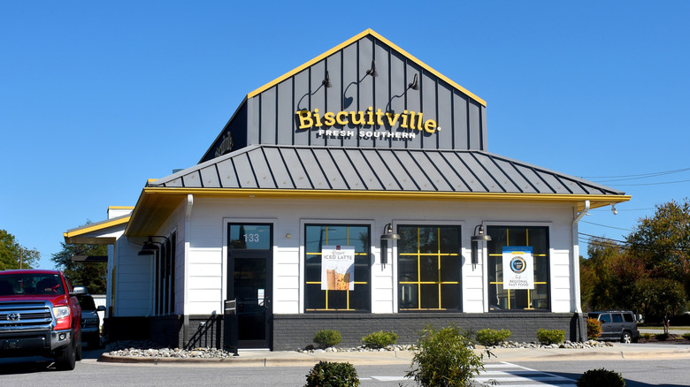 It's not often that a fast food joint focuses its menu on breakfast items. However, Biscuitville has clearly mastered the morning meal game. The restaurant's menu is centered around its famous freshly made buttermilk biscuits. These biscuits are absolutely no joke; they've got a crispy, golden brown exterior, soft, fluffy interior, with a divine salty, buttery, slightly tangy flavor. These biscuits serve as the foundation for an extensive sandwich menu that includes breakfast options loaded with eggs, cheese, and bacon, or savory lunch options with country ham, grilled or fried chicken, fried steak, pork chops, and sausage. Alongside the biscuit sandwiches, you can order side dishes like cheese grits, sausage and gravy, buttermilk pancakes, and hashbrowns.