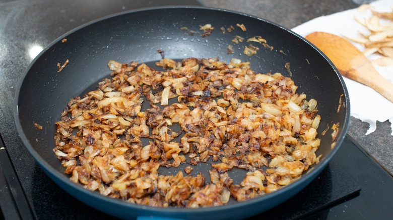 As food cooks down in a pan, the Maillard reaction occurs, caramelizing foods and bringing out even more flavor. Bits of food often get stuck on the bottom of the pan, and properly deglazing is a way of removing them. By adding bourbon to the pan, you're ensuring those flavors are kept intact while also adding a new kind of taste to whatever you're preparing. This doesn't just work with onions — you can add a little bourbon while deglazing the pan with other vegetables, like asparagus, or even steak and chicken.