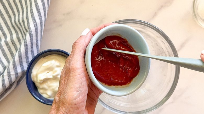 - In a medium bowl, combine the mayonnaise and ketchup until well blended.