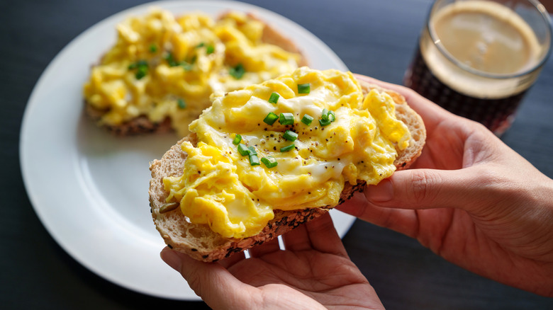 If you're cooking scrambled eggs, try mixing a spoonful of tapenade into the still-uncooked eggs. The tapenade will warm, its oils melting lusciously into the mixture — giving you a savory bite perfect on a piece of milk bread or alongside a croissant. For the omelet treatment, add tapenade on its own or with other Provence-style ingredients, such as oil-packed tuna, spinach, and fresh haricots verts.