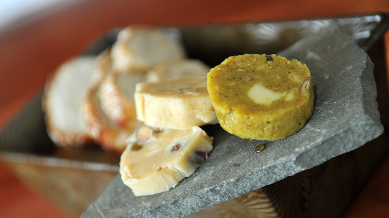 Remember butter boards? They were a hot commodity for about five minutes — adorable hors d'oeuvres boards where folks spread beautiful, rich, yellow butter on charcuterie boards and adorned them with dippables from bread to fresh radishes. In my opinion, these boards didn't go far enough into Imaginationland, and those smeared butters could have hugely benefited from the addition of an olive tapenade. On that same wavelength, you can use your freshly made tapenade as part of a deliciously rich compound butter. Compound butters are just that — butter mixed with other ingredients, be it garlic and herbs, miso, gorgonzola or bleu cheese, sweet items like maple or candied oranges, etc. The possibilities are endless.