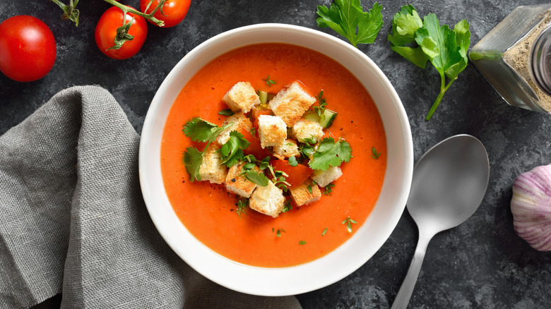 Croutons rank right up there with ice cubes and simple syrup on the list of items that you should probably just make at home. It is simply too easy to freeze a water-filled tray, simmer sugar and water, or bake some stale bread for you to even think about paying a markup for someone else to do it for you. But that doesn't mean that you must suffer the same, boring, old croutons every single time a baguette's about to go bad. Dedicated sourdough croutons, instead, make the simple carbolicious garnish just a little zestier.