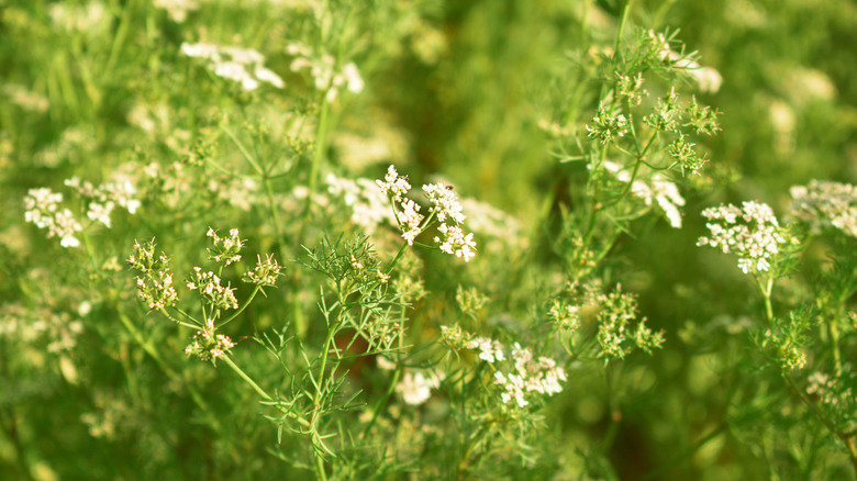 Cilantro, or coriander to those outside of the Americas, is one of the most important herbs in all of cookery. From Mexico to Vietnam, it's the bedrock of some of the world's most popular cuisines — and yet its flowers still manage to fly under the radar. They're small, usually white in color and very thin, almost lacey in texture. When cilantro sprouts in warm weather, they'll crop up (much like basil flowers) on the ends of the plant's stalks. They form just before coriander seeds (which are in themselves a delicious ingredient commonly used in curries, especially in South Asian cooking).