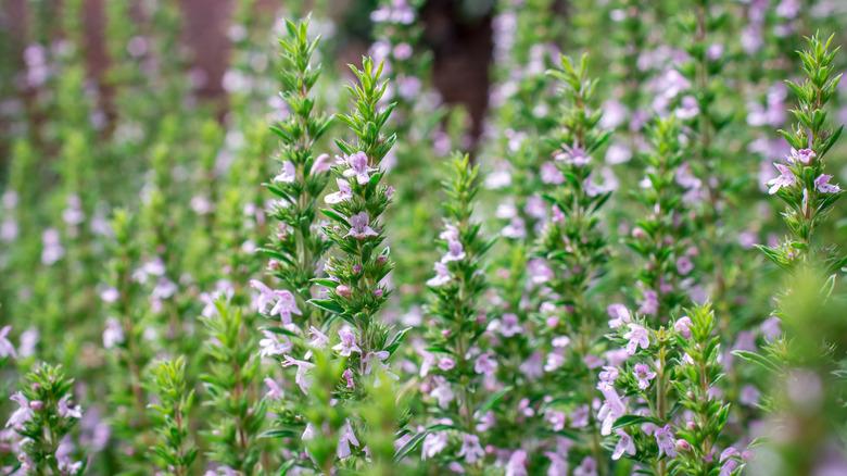 Thyme, like rosemary and oregano, is part of the family of hard herbs — deeply aromatic, earthy plants that stand up to (and even benefit from) cooking. But while the herbs themselves are dark and hearty, their flowers are surprisingly dainty. They are small, purple or pink in color, and tend to grow in clusters on common thyme and lemon thyme plants. Like the herb itself, thyme flowers are warm — a little spicy and peppery, with a hint of cloves. They are less intense, however, and have a slightly floral touch — one that's accented by a hit of citrus in lemon thyme flowers.