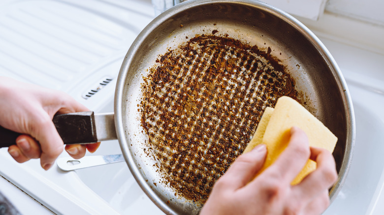 The carbonation in club soda not only makes it a terrific metal cleaner but also makes it great for removing burnt food that's stuck to pans, including non-stick surfaces. The same carbonic acid that removes so many other stains will also remove burnt food, which is essentially a big stain gradually bonding with the metal pot. Pour club soda into your burnt pan while it's still hot, using enough to cover the stains. Let the soda sit for at least 10 minutes — you may want to let it sit for longer if you don't see the food starting to lift off the bottom of the pan. You can use this cleaning hack on both cast iron and non-cast iron pans.