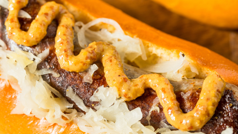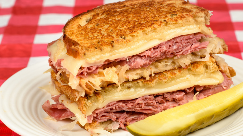 Thousand Island dressing may be the traditional choice to dress your corned beef sandwich, but mustard is another fantastic option. A Reuben uses Russian dressing, which combines ketchup, mayo, and horseradish for a tangy taste, but there's nothing quite like a corned beef and mustard sandwich when it comes to bold flavor. Strong Dijon is a fantastic choice that has a similar type of spice to horseradish. The condiment brings in extra freshness to the salty meat, which is made by curing beef with a lot of salt.
