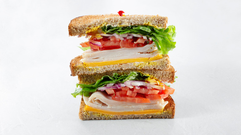Turkey with cheese — especially provolone or cheddar — has pretty widespread appeal because the meat and cheese combo goes with just about anything. This viral sandwich from Sprouts Farmers Market combines turkey and provolone with Dijon mustard and is pretty simple, but that doesn't keep it from being super tasty and good for you. It has nutrient-rich ingredients, like leafy lettuce and red onion, that all bring in their own texture and taste. The Dijon mustard is there to keep the sandwich from being too dry, as well as add the signature zing that brings it all together.