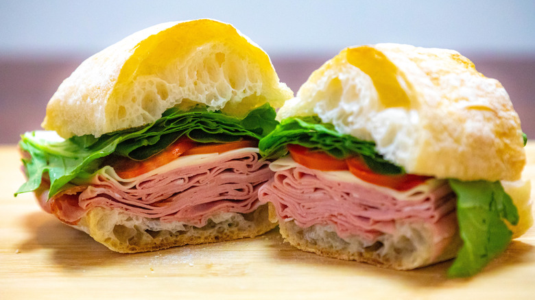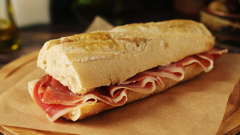 Don't be fooled by the humble "ham sandwich" name on this tasty handheld, which is a favorite of Martha Stewart. It uses gourmet Iberian ham, which can be pretty pricey, and pairs it with slices of creamy mozzarella. Baby romaine lettuce brings in a little extra crunch, while the strong duo of Dijon mustard and Martha's red pepper mayo pulls the entire sandwich together.