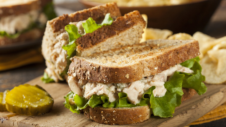 It's no secret that mustard makes a nice addition to tuna salad, but you may be surprised just how many varieties hold up well with the strong tuna flavor and creamier texture on this sandwich. You can mix mustard into your tuna salad spread, but adding a little bit of sweeter honey mustard to your bread is another good hack. The flavors unexpectedly work well together, and you can even use this trick to upgrade a Subway sandwich. Ask for honey mustard and toasted bread, another key component that helps the texture of this sammie stay crispy and delicious.
