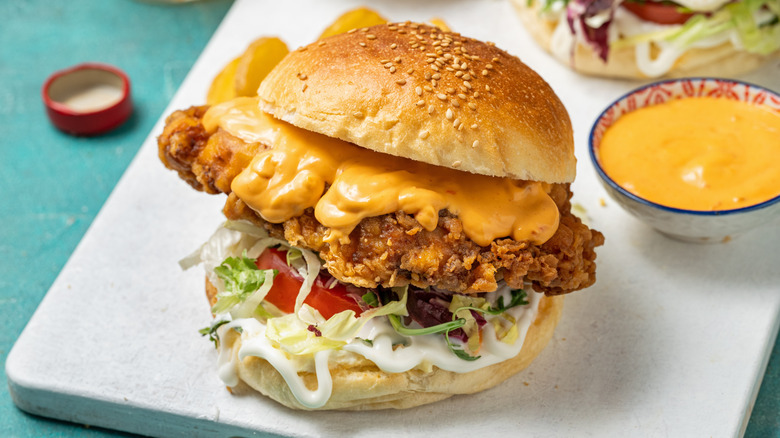 Add spicier hot mustard to a fried chicken sandwich, where it works well to bring tons of flavor to a texture-rich handheld. Some versions rely on more mustard seeds while others incorporate chili peppers to add the heat. If you want that extra little kick without it being too much, mix in a little bit of creamy mayo or sour cream. Consider your other toppings as well and slather on coleslaw for a little extra crunchy texture alongside your chicken.