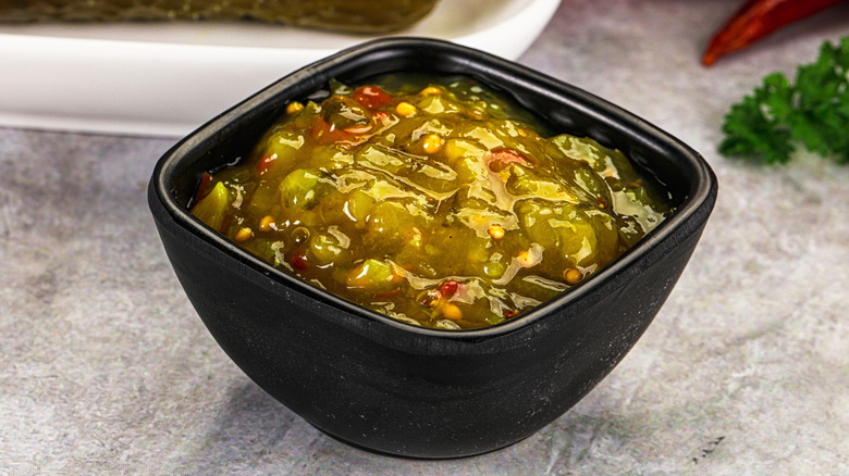 Piccalilli is made with pickled veggies, plus plenty of mustard and vinegar, so it has a pretty strong flavor. A bright green version makes a notable appearance on a Chicago-style hot dog.
