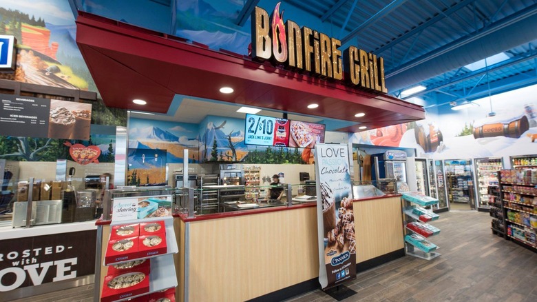 There's nothing subtle about this Utah-based, 800-location chain, which themes its gas station around the concept of adventure. The decor focuses on action-themed murals, with plenty of snowboarding and mountain climbing mannequins. And as everyone knows, adventure runs on food, and Maverik stands out with its freshly made options, aptly titled BonFire food. According to reviews, the chain's Tex-Mex-inspired burritos, customizable fountain drinks, and cookies (especially the Macachocochicoconut cookies), are exactly what you want to eat in the wild — or simply in the passenger seat of your car. So if you are a fan of gourmet camping food, make Maverik your next stop. Because nothing says "adventure" like a croissant-wrapped cheddar bratwurst.