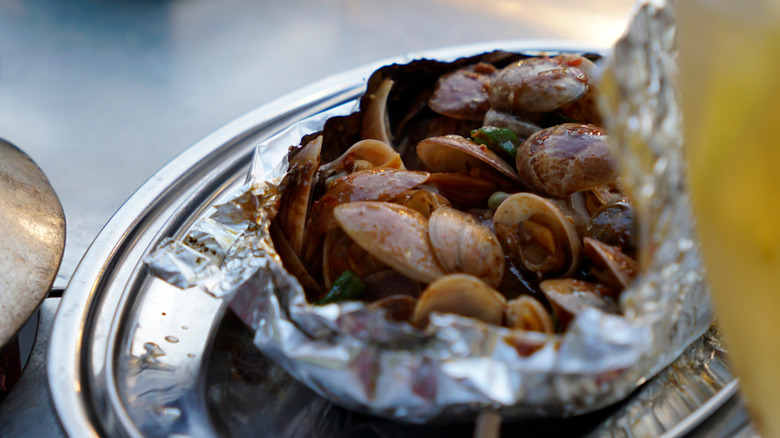 Hot summer nights on the beach aren't complete without a clambake. One of the best ways to keep this classic New England seafood feast manageable is to cook the common staples — like clams, red potatoes, smoked sausage, and corn — in foil packets over a fire. The foil encourages the components to steam and cook over the fire and offers diners a balanced serving of each of the ingredients.