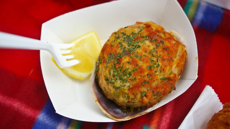 If you haven't noticed, New Englanders love their seafood — and take things a little too seriously at times. Though there are some bitter divides over lobster roll and chowder styles, there's little contention surrounding the beloved stuffie — also known as a "stuffed quahog." This Rhode Island favorite has a unique Portuguese influence, thanks to the addition of chouriço or linguiça sausage. The massive quahogs are steamed until they open, then the clams are cooked with the sausage, onions, and peppers. Once the filling has been stirred with seasoned breadcrumbs, it's tucked back into the clamshells and baked until crispy.